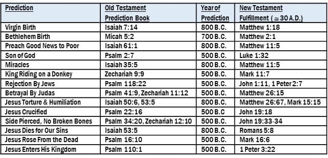 The below table is a partial list of just fourteen of the Messianic “Predictions” contained in the Old Testament and their “Fulfillment” by Jesus in each case, as documented in the New Testament. These fulfilled prophecies offer strong evidence pointing towards Jesus as the Messiah prophesied in the Old Testament. Dr. Norman Geisler, a recognized Christian theologian and philosopher, confirmed the uniqueness of Jesus in history by stating, "Only Jesus has prophecies made hundreds of years in advance made literally true."